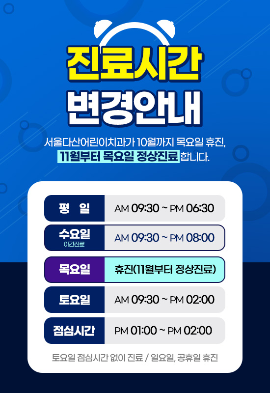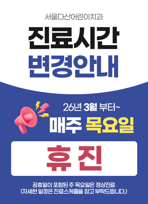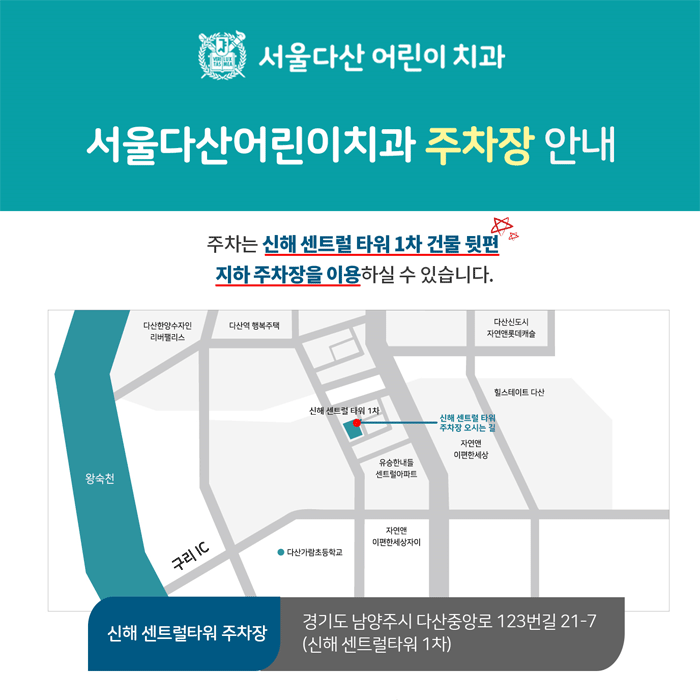 주소 : 경기도 남양주시 다산중앙로 123번길 21-7 (신해 센트럴타워 1차) 5층 대표 : 김정우 사업자등록번호 : 117-96-62253 전화 : 031-566-6400, 6401 팩스 : 031-567-6402 copyright (C) 2019 Seoul Dasan Children Dental Clinic all right reserved.
